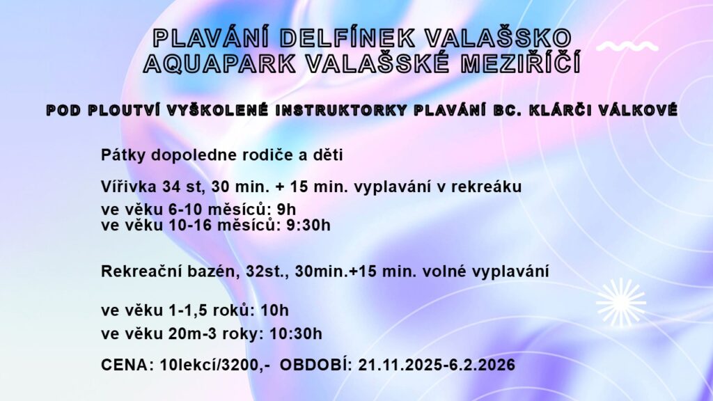 Co se u nás dějeRozpis Plavání ve Valašském Meziříčí aquapark Přihlásit se můžete zde: https://delfinekvalassko.cz/prihlaska/