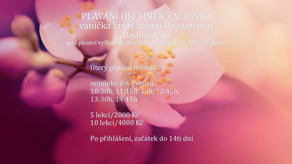 Co se u nás dějeRozpis Rozpis plavání pro nejmenší ve vaničce na krytém bazéně v Rožnově pod Radhoštěm, přihlásit se můžete zde: https://delfinekvalassko.cz/prihlaska/