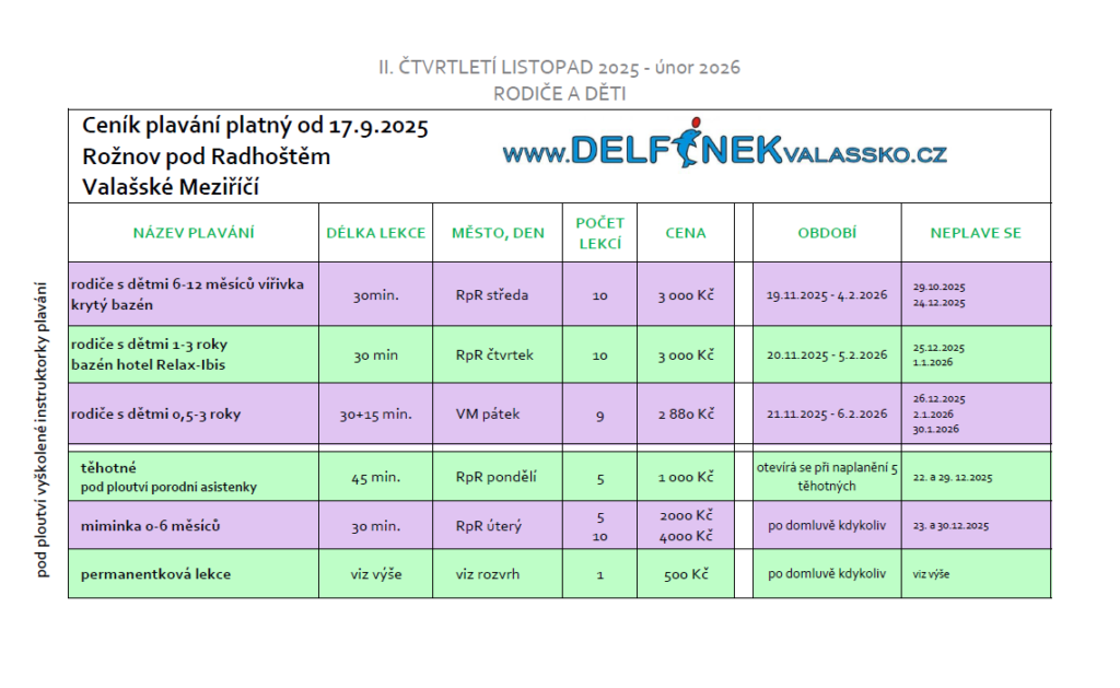 Ceník plavání s Delfínkem Valašsko