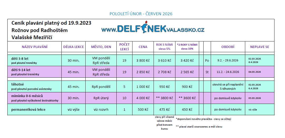 II. pololetí plavecké tréninky, miminka, těhotné únor – červen 2026